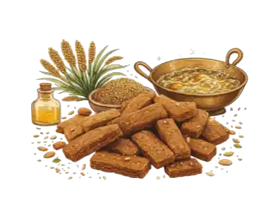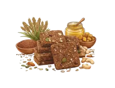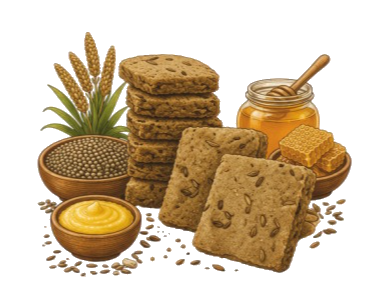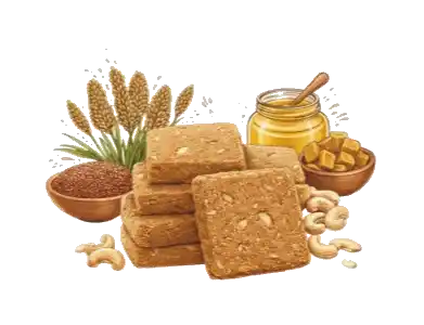 Our snacks are made with millets, traditional sweeteners like jaggery and honey, rock salt, and cold-pressed oils. We avoid maida, refined sugar, refined oil, preservatives, and artificial additives.